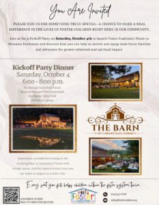 Join us for a kickoff party on October 4th at The Barn at Carmichael Farms! Hear about our Meals to Missions fundraiser and how you can impact the lives of foster families. There will be dinner, music, and a chance for you to get involved in impacting a child’s life.
